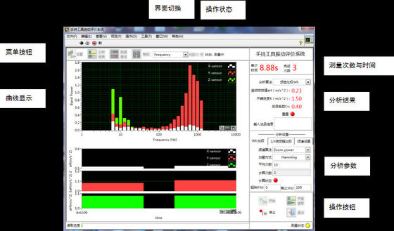 सॉफ्टवेयर इंटरफ़ेस ऑपरेशन बटन, मेनू बटन, वक्र डिस्प्ले इंटरफ़ेस, विश्लेषण सेटिंग और विश्लेषण परिणाम से बना है।उपयोगकर्ता संचालन की सुविधा के लिए विश्लेषण सेटिंग और डिस्प्ले इंटरफ़ेस शीर्ष इंटरफ़ेस पर प्रदर्शित होते हैं।इंटरफ़ेस स्विचिंग के माध्यम से, समय डोमेन वक्र, कंपन ऊर्जा स्तर वक्र, 1 ≤ 3 ऑक्टेव वक्र, पावर स्पेक्ट्रम वक्र और माप प्रक्रिया के परीक्षण डेटा विश्लेषण इंटरफ़ेस को प्रदर्शित और स्विच किया जा सकता है।